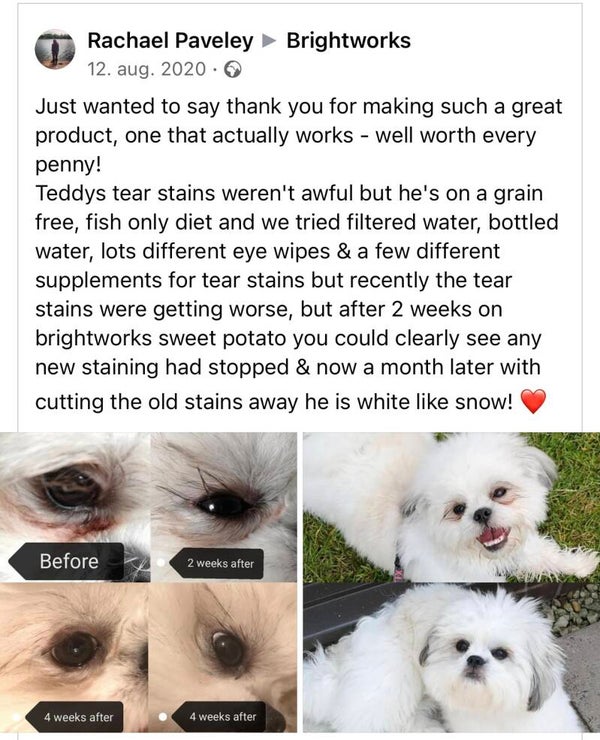 Naturlig kur mot misfarging i pelsen. Kan brukes på valper, hunder og katter.